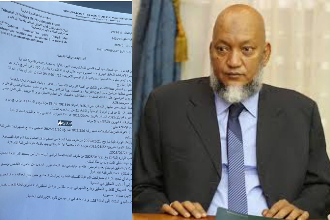 أمر قاضي التحقيق رئيس الديوان بمحكمة ولاية نواكشوط الغربية بتجديد الرقابة القضائية على الوزير السابق سيدنا عالي محمد خونه لمدة شهرين قابلة للتجديد خمس مرات، بعد أن انتهت فترة الرقابة السابقة بتاريخ 21 يناير 2026.