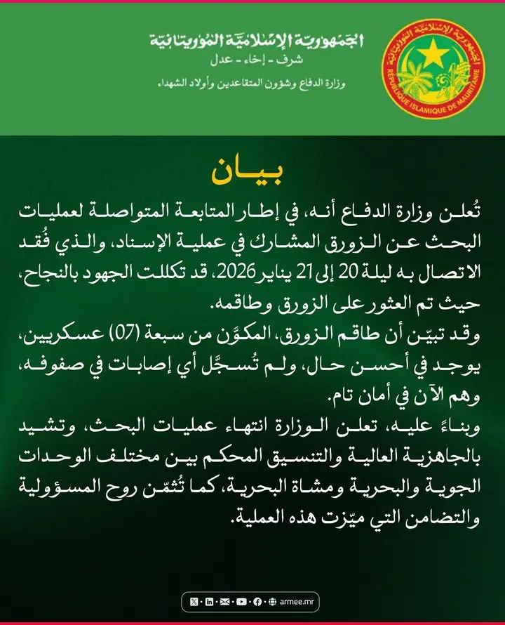 أعلن الجيش العثور على الزورق الذي كان قد فُقد الاتصال به خلال ليلة 20 إلى 21 يناير الجاري، أثناء مشاركته في عملية إسناد.