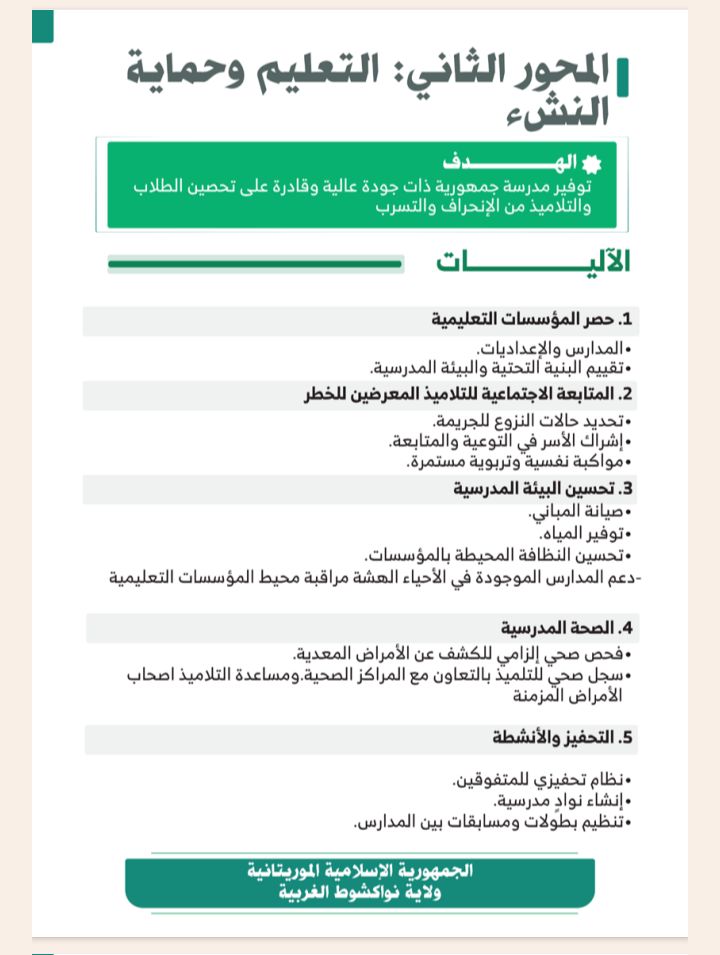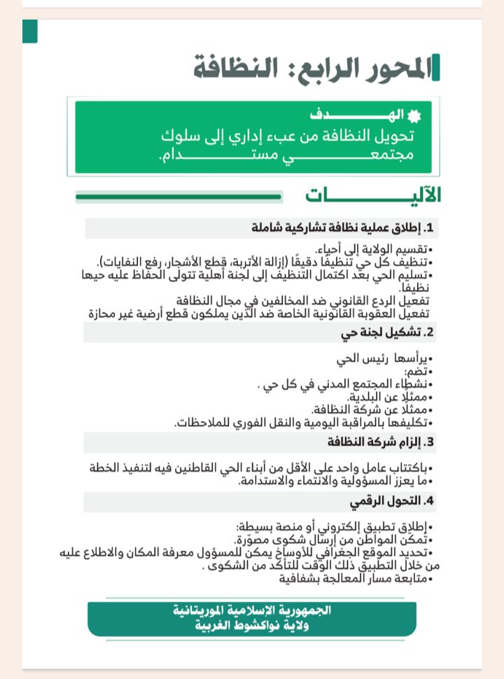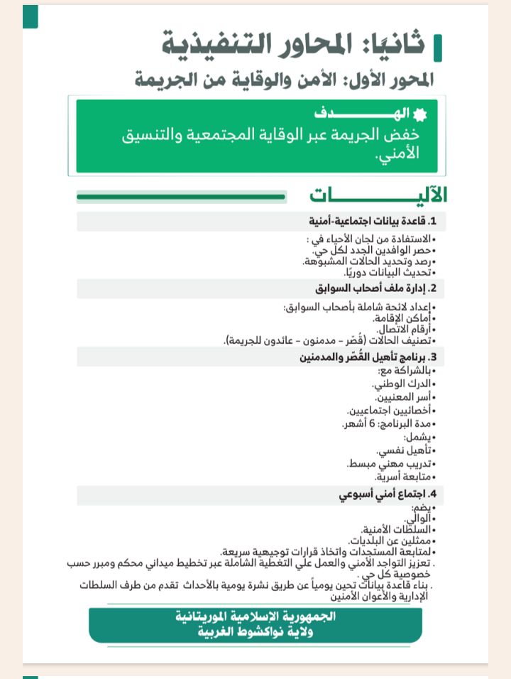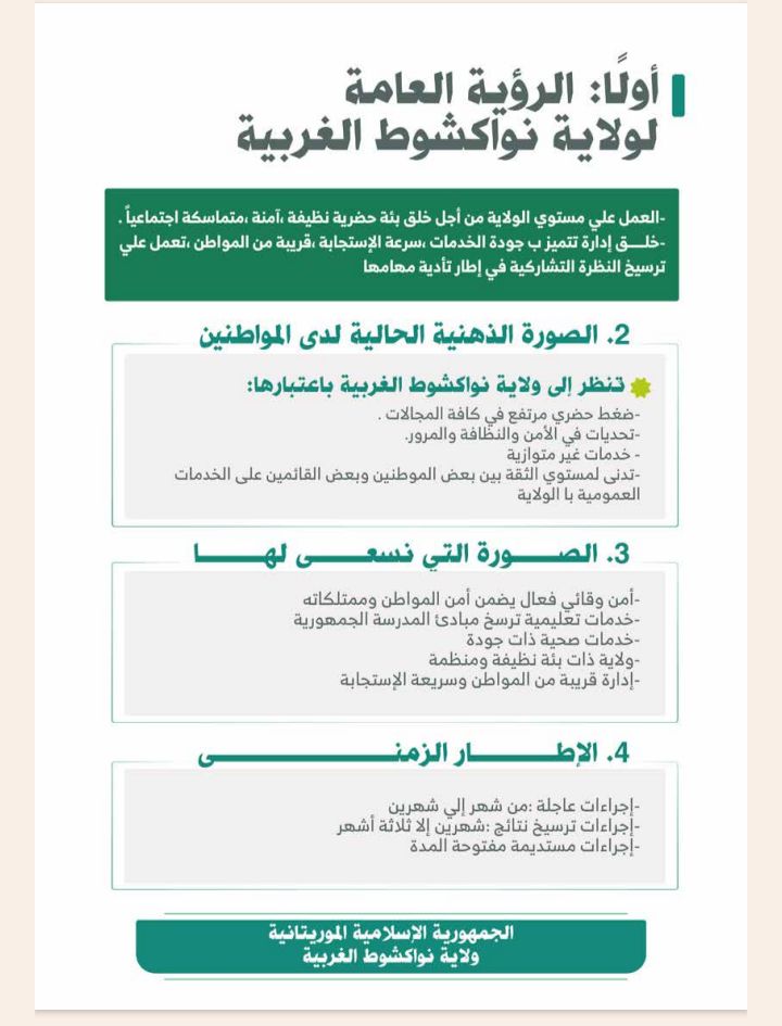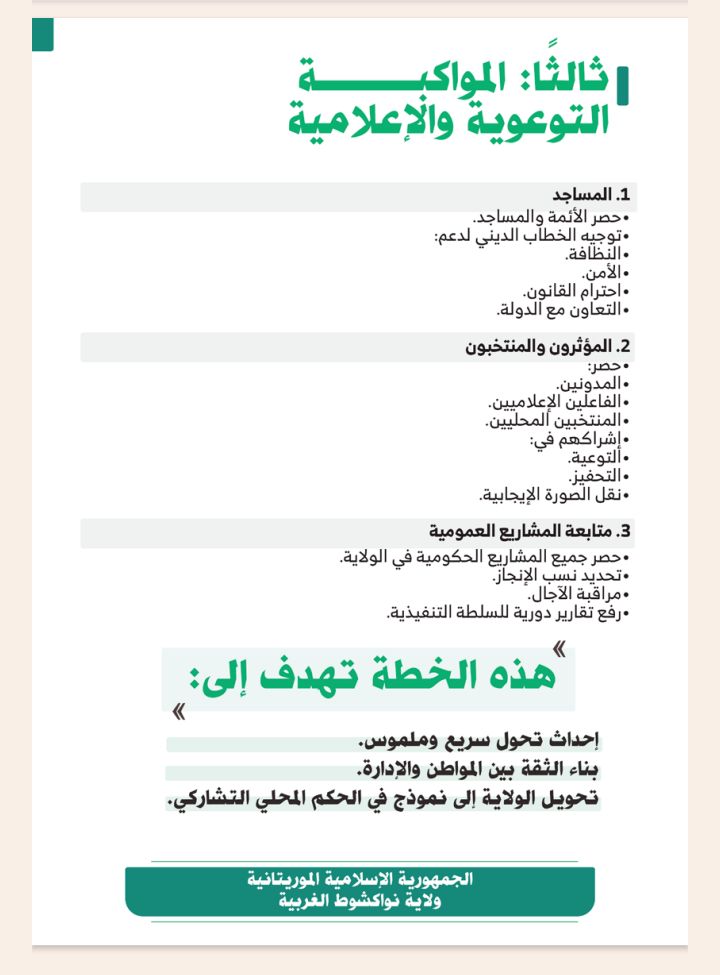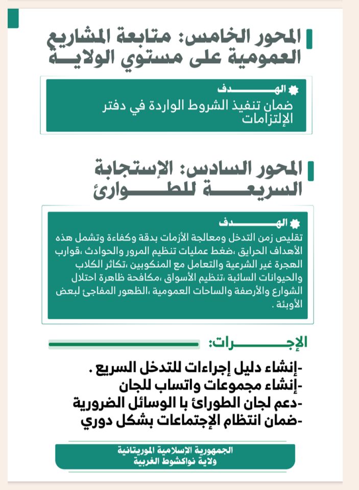 وتشمل الخطة أيضا متابعة المشاريع العمومية والاستجابة السريعة للطوارئ، في إطار جهود الشراكة بين وزارة الداخلية والولاية لتعزيز الثقة بين المواطنين والإدارة وتحويل نواكشوط الغربية إلى نموذج للحكم المحلي التشاركي.