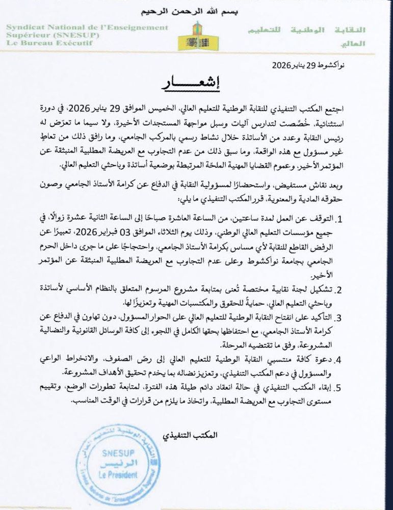 وأكدت النقابة أنها شكلت لجنة لمتابعة مشروع المرسوم الخاص بالنظام الأساسي لأساتذة التعليم وباحثي التعليم العالي، لحماية الحقوق والمكتسبات المهنية، مشددة على انفتاحها للحوار المسؤول دون التنازل عن الدفاع عن كرامة الأستاذ الجامعي.