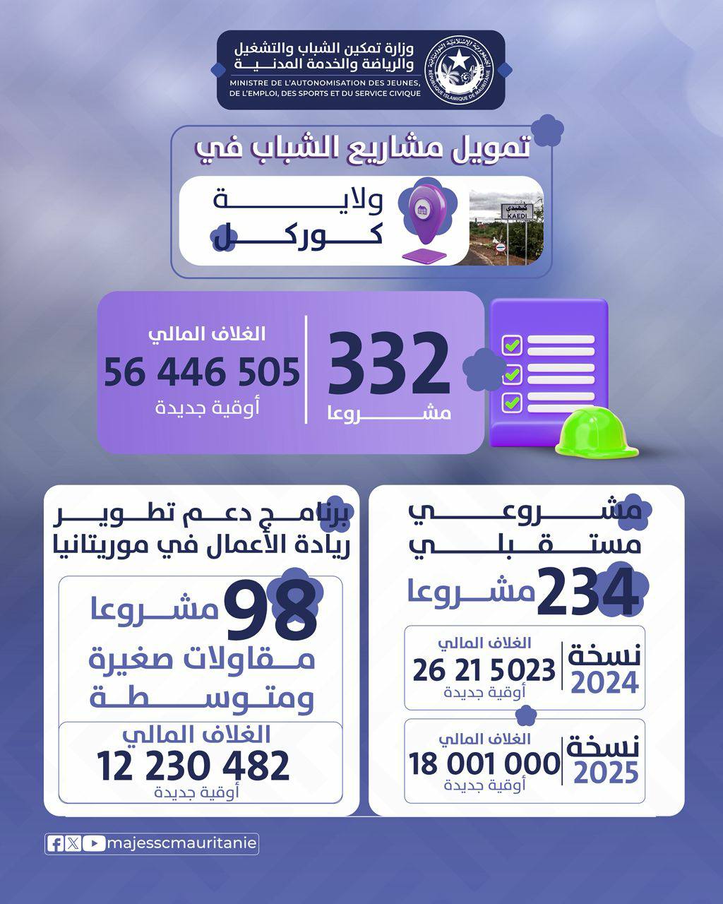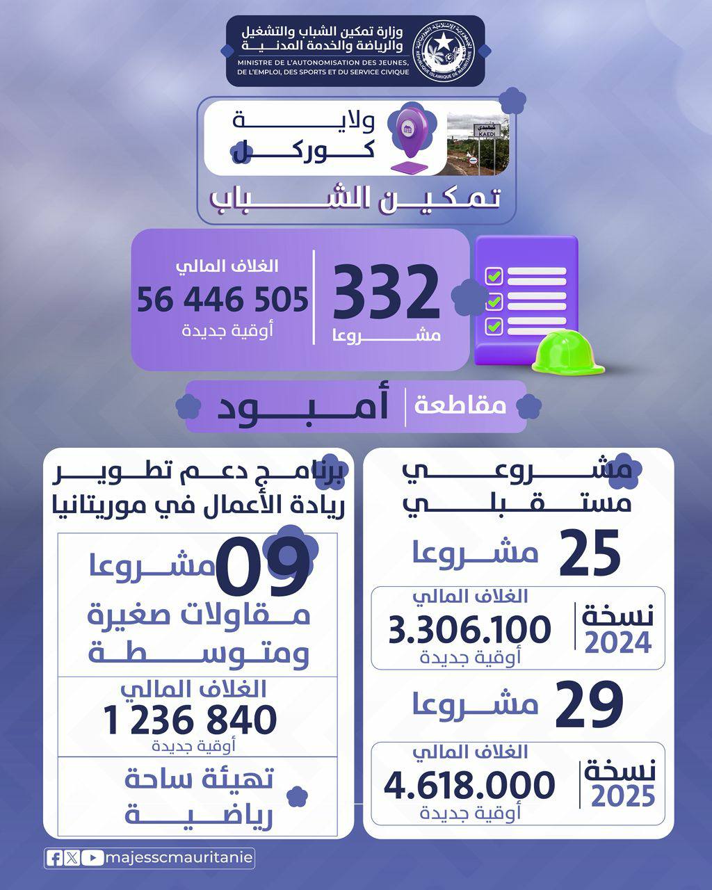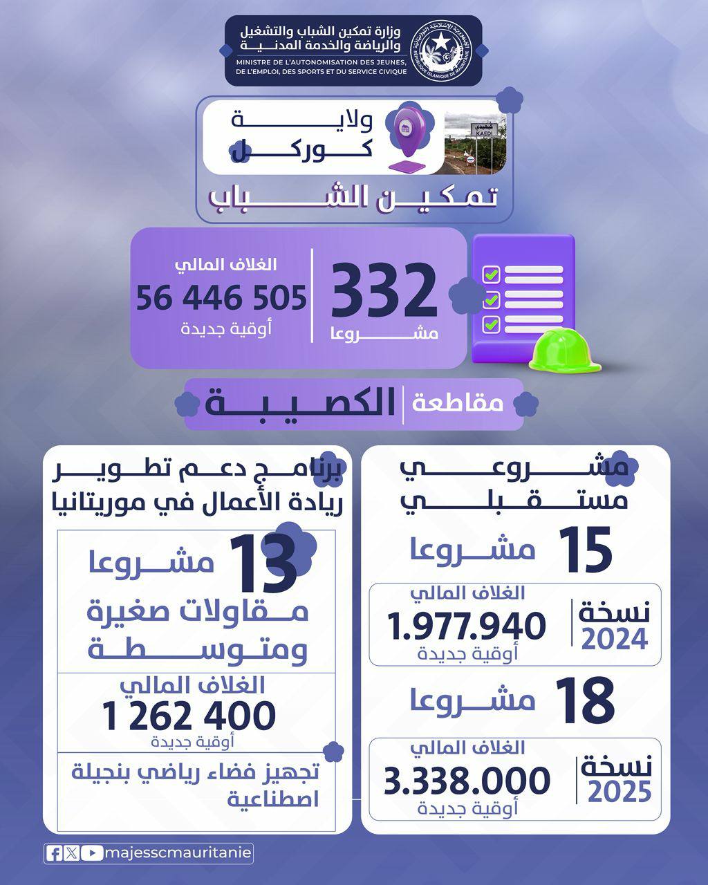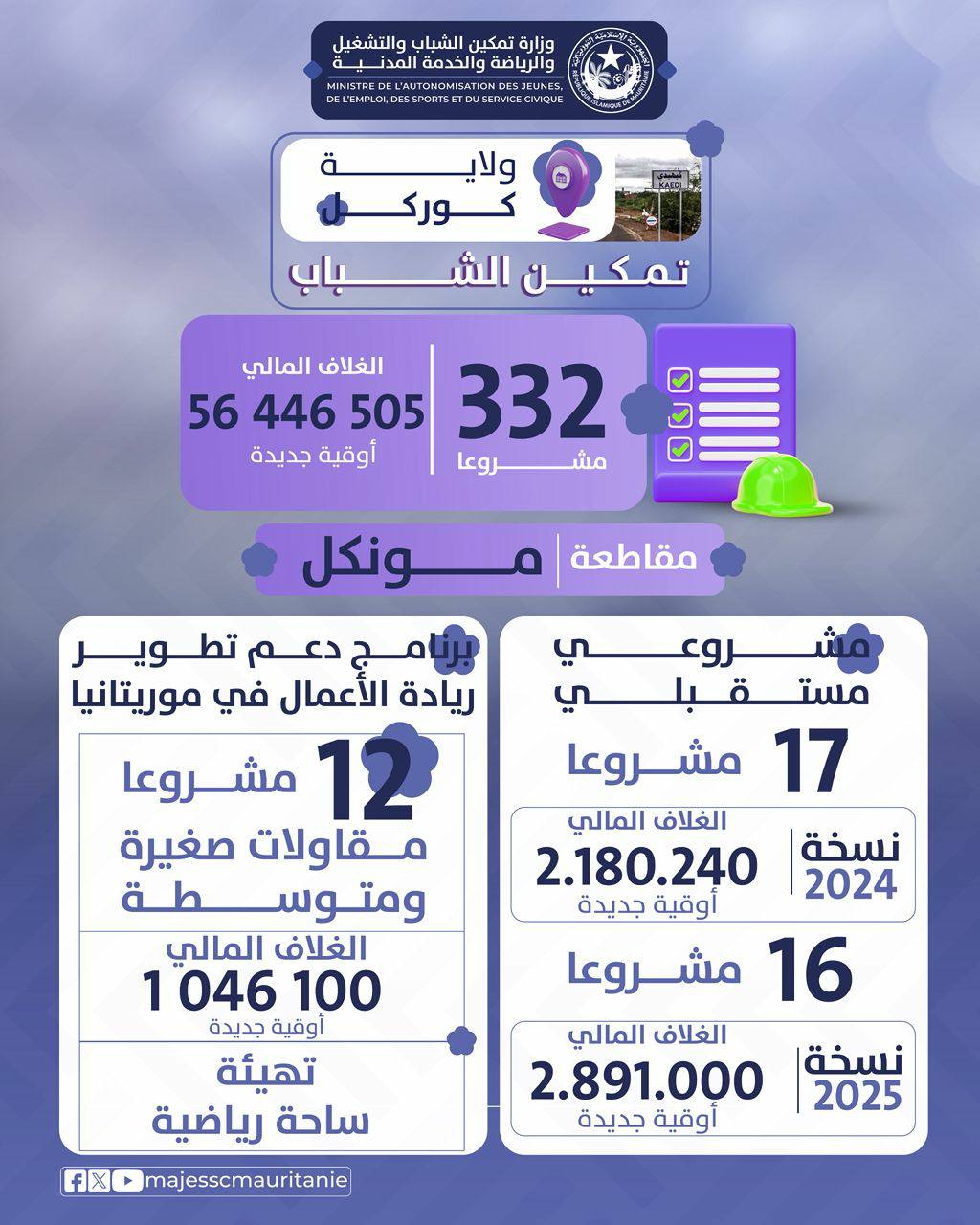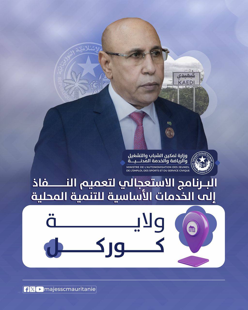 قدمت وزارة تمكين الشباب والتشغيل والرياضة والخدمة المدنية حصيلة القطاع في إطار تنفيذ البرنامج الاستعجالي لتعميم النفاذ إلى الخدمات الأساسية للتنمية المحلية على مستوى ولاية كوركل، بمناسبة الزيارة يؤديها رئيس الجمهورية محمد ولد الشيخ الغزواني لمقاطعات الولاية.
