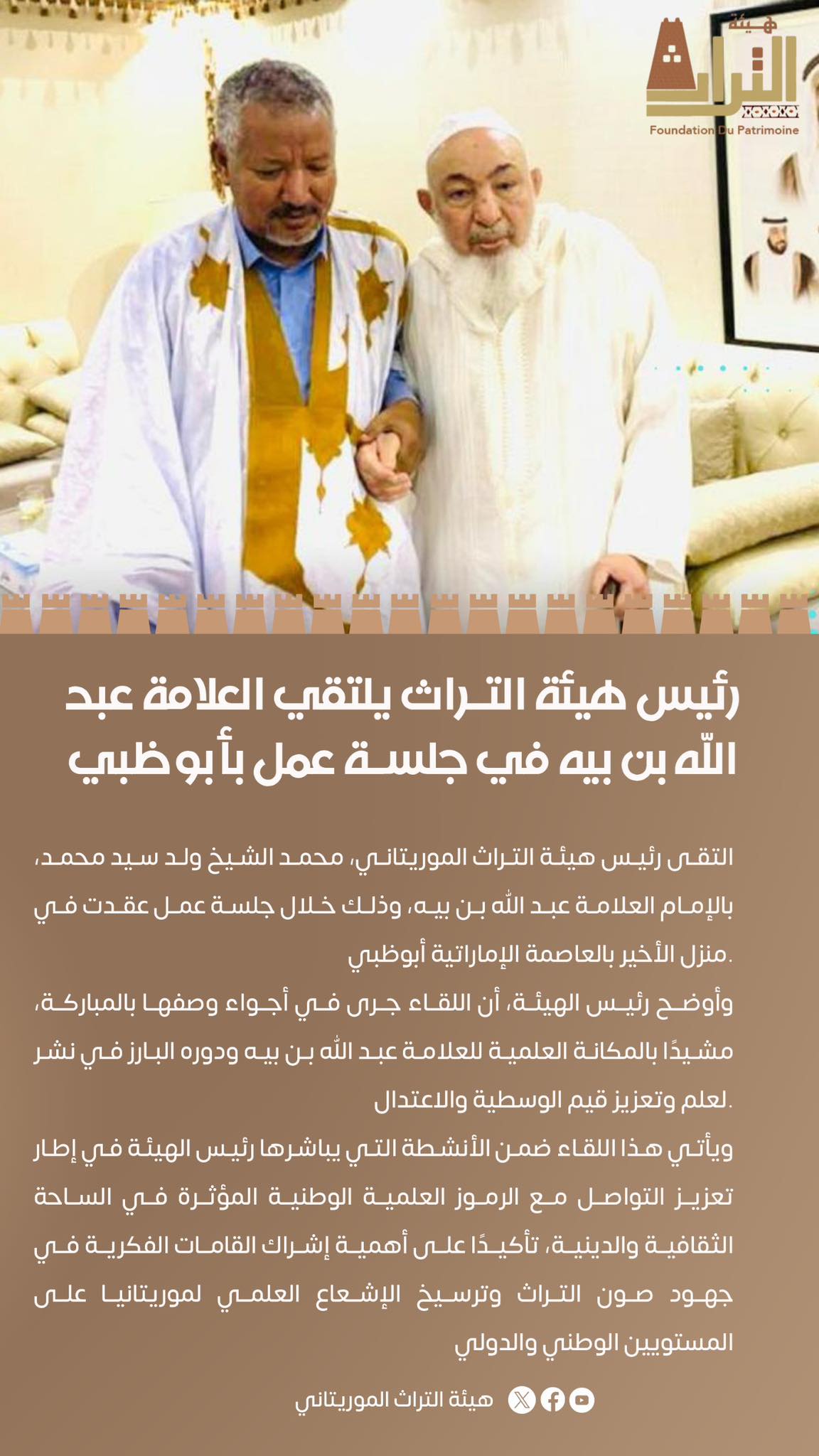 التقى رئيس هيئة التراث الموريتاني، محمد الشيخ ولد سيد محمد، بالإمام العلامة عبد الله بن بيه، وذلك خلال جلسة عمل عقدت في منزل الأخير بالعاصمة الإماراتية أبوظبي.