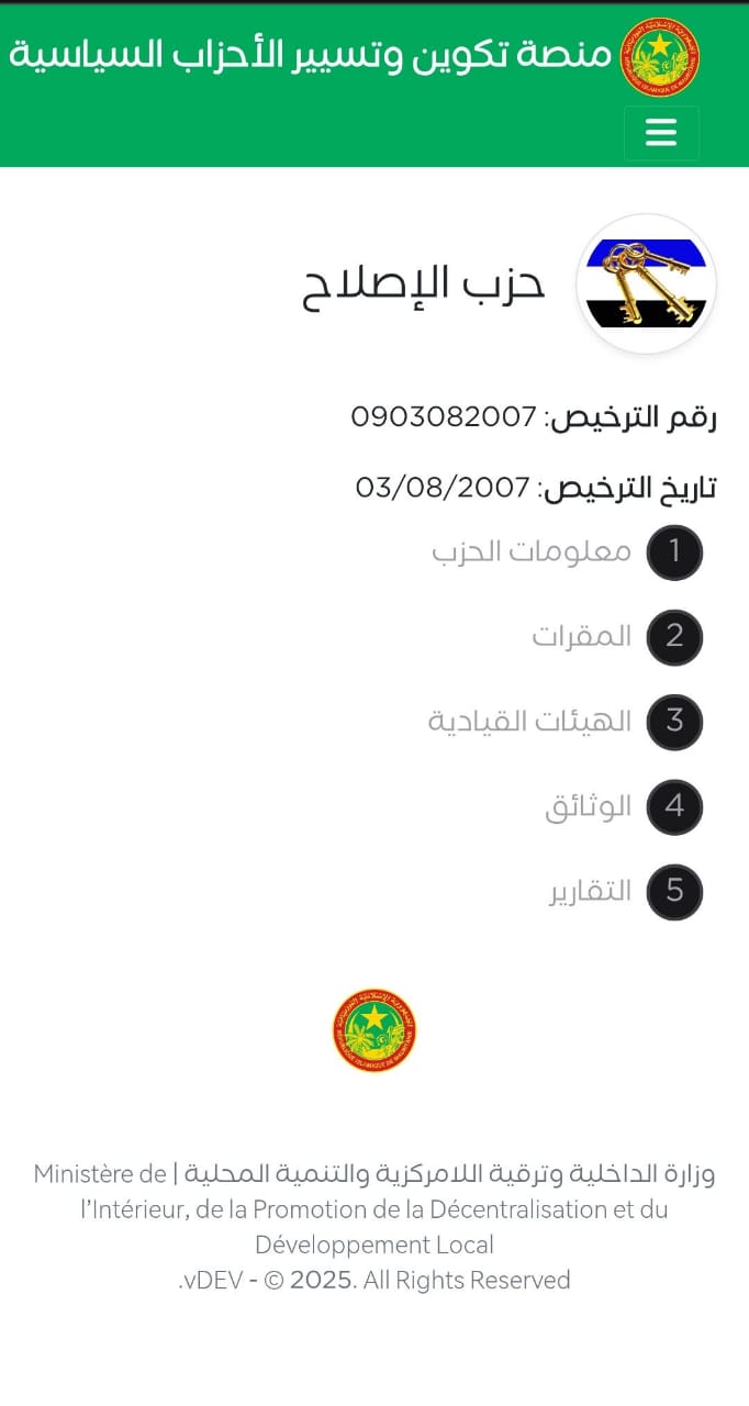 وتلبية لتلك الشروط أودع حزب الإصلاح المنصة المذكورة قبل انتهاء الأجل المحدد قانونا في 24 فبراير 2026 لوائح قياداته السياسية المتكونة من مجلسه والوطني 257عضوا ومكتبه السياس 84 بكامل تشكيلاته( المكتب التنفيذي واللجنة الدائمة ) أي كجموعه 343 شخصية قيادية من الاطر السامين والفاعلين السياسيين بكامل بياناتهم وأرقامهم الوطنية إضافة إلى رؤيته السياسية ولوائحه التنظيمية وتقريرا عن سنة 2025 عن وضعية الحزب ونشاطه الداخلي والخارجي واستيراتيجيته للعمل لسنة 2026 بما في ذلك حضوره السياسي الخارجي بما في ذلك دخوله الاشتراكية الأممية وتحالف الأحزاب العربية التقدمية وحضوره السياسي الداخلي الوطني الأفقي وحالته الإدارية ووضعيته المالية ،فضلا عن إحداثيات 42 مقرا مفتوحا في جميع عواصم الولايات ومقاطعات نواكشوط و بعض المقاطعات على عموم التراب الوطني.