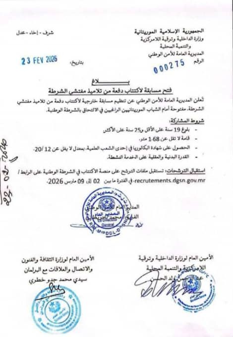 أعلنت وزارة الداخلية عن فتح باب الترشح لمسابقة خارجية لاكتتاب دفعة من تلاميذ مفتشي الشرطة.
