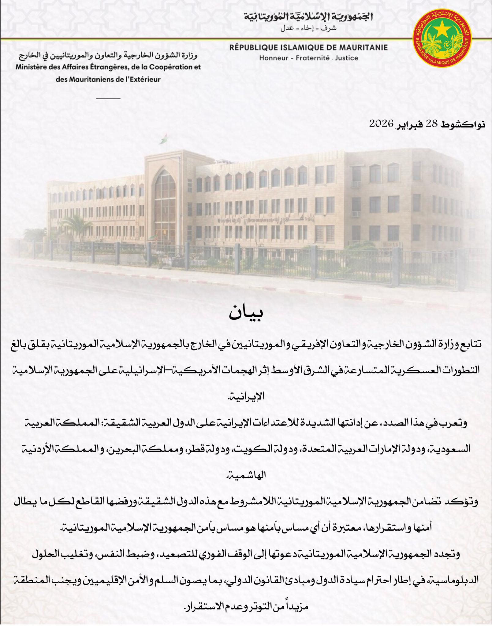 وأعربت الخارجية الموريتانية عن قلقها البالغ إزاء التطورات العسكرية المتسارعة في منطقة الشرق الأوسط، في أعقاب الهجمات الأمريكية الإسرائيلية على إيران، طبقا لنص البيان في الصورة المرفقة.