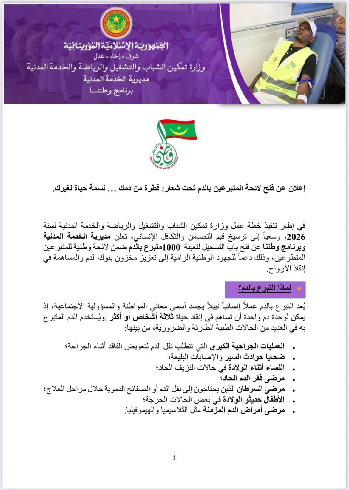 تعلن مديرية الخدمة المدنية وبرنامج وطننا عن دعوة للتسجيل في اللائحة الوطنية للمتبرعين بالدم في إطار حملة تستهدف تعبئة 1000 متبرع بالدم عام 2026 تحت شعار: قطرة من دمك … نسمة حياة لغيرك.