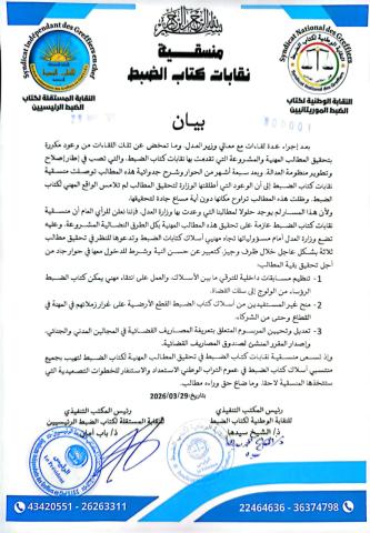 لوحت منسقية نقابات كتاب الضبط باتخاذ خطوات تصعيدية، عقب ما وصفته بتعثر الاستجابة لمطالبها المهنية رغم سلسلة من اللقاءات مع وزارة العدل استمرت عدة أشهر.