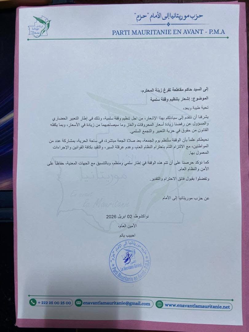 أعلن حزب موريتانيا إلى الأمام عن رفضه قرار السلطات بعدم الترخيص لوقفة احتجاجية كان مقررا تنظيمها في ساحة الحرية، احتجاجا على الزيادات الأخيرة في الأسعار التي أقرتها الحكومة.