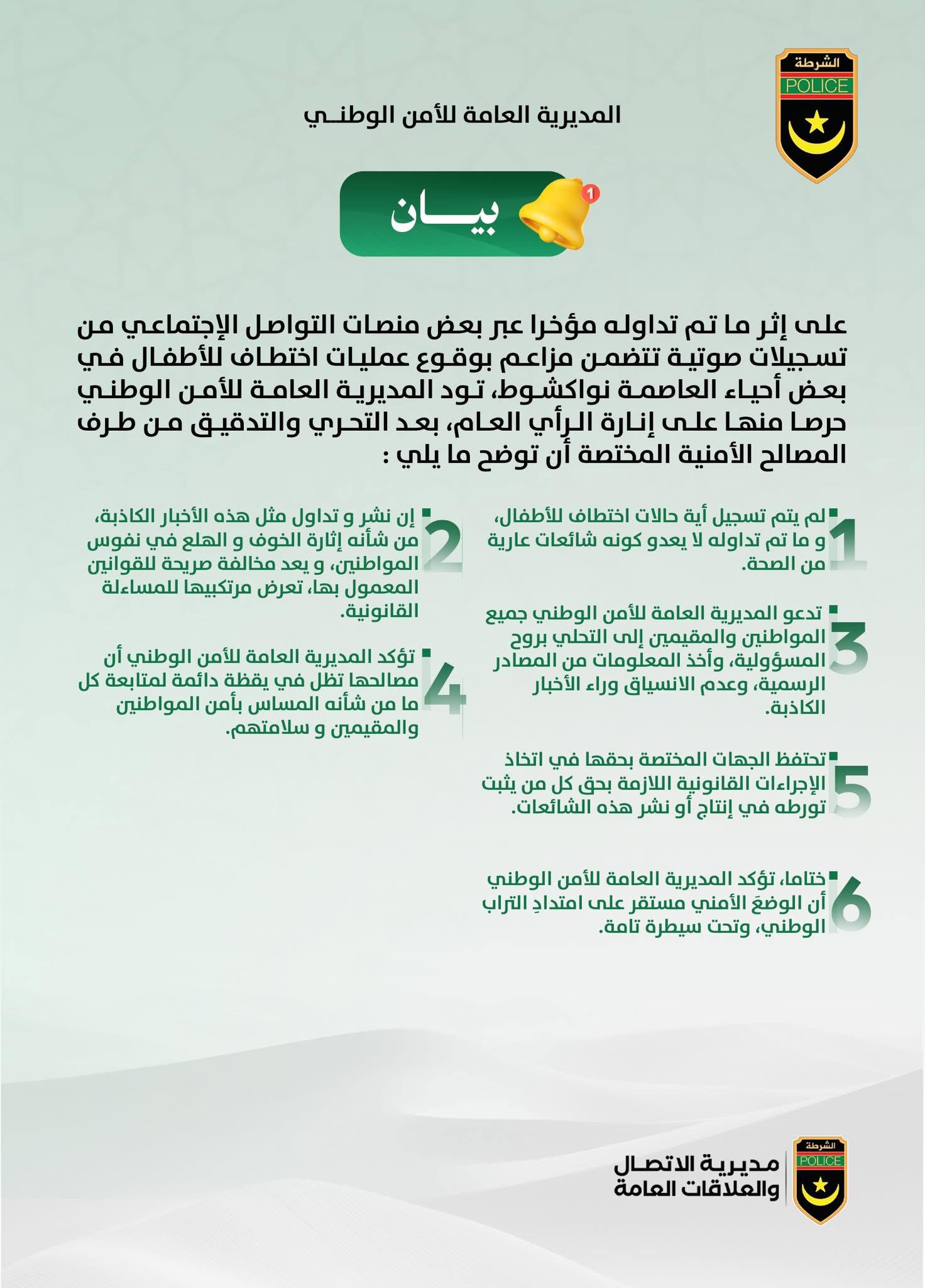 نفت الشرطة الوطنية الموريتانية صحة ما تم تداوله عبر بعض منصات التواصل الاجتماعي بشأن تسجيل حالات اختطاف أطفال في عدد من أحياء العاصمة نواكشوط.
