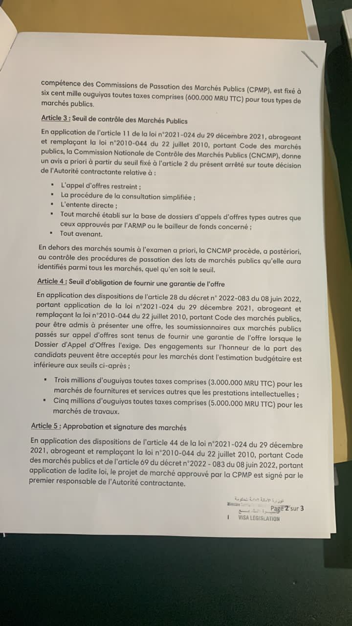 وكان المقرر الصادر 2021 ينص على أن "المبلغ الذي يكون اعتبارا منه الإنفاق العمومي من اختصاص لجان إبرام الصفقات العمومية يحدد بخمسة عشر مليون (15.000.000) أوقية جديدة، بما فيها إجمالي الرسوم بالنسبة للتوريدات والخمات وخمسة وعشرون مليون (25.000.000) أوقية جديدة، بما فيها إجمالي الرسوم بالنسبة للأشغال، وثلاثة ملايين (3.000.000) أوقية جديدة بالنسبة للخدمات الفكرية».