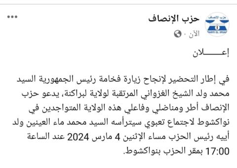 ترفع وزارة الداخلية واللامركزية إلى علم الفاعلين السياسيين الذين سبق لهم إيداع ملفات لدى الإدارة العامة للصياغة والشؤون السياسية والحريات العامة، لغرض الحصول على تراخيص لأحزاب سياسية، وكذلك الذين تم حل أحزابهم على أساس نتائج انتخابات 2018 و 2023، أن عليهم الحضور لدى مصالح الإدارة المعنية، ابتداءا من يوم الإثنين 4 مارس 2024، الساعة 11 صباحا.