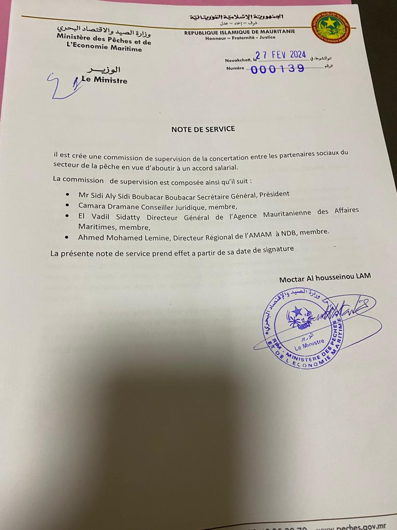 أصدر وزير الصيد والاقتصاد البحري المختار الحسينو لام مذكرة لتعيين أعضاء لجنة مشاورات بين الشركاء الإجتماعيين في قطاع الصيد من أجل التوصل إلى توافق يفضي إلى اتفاق على الرواتب.