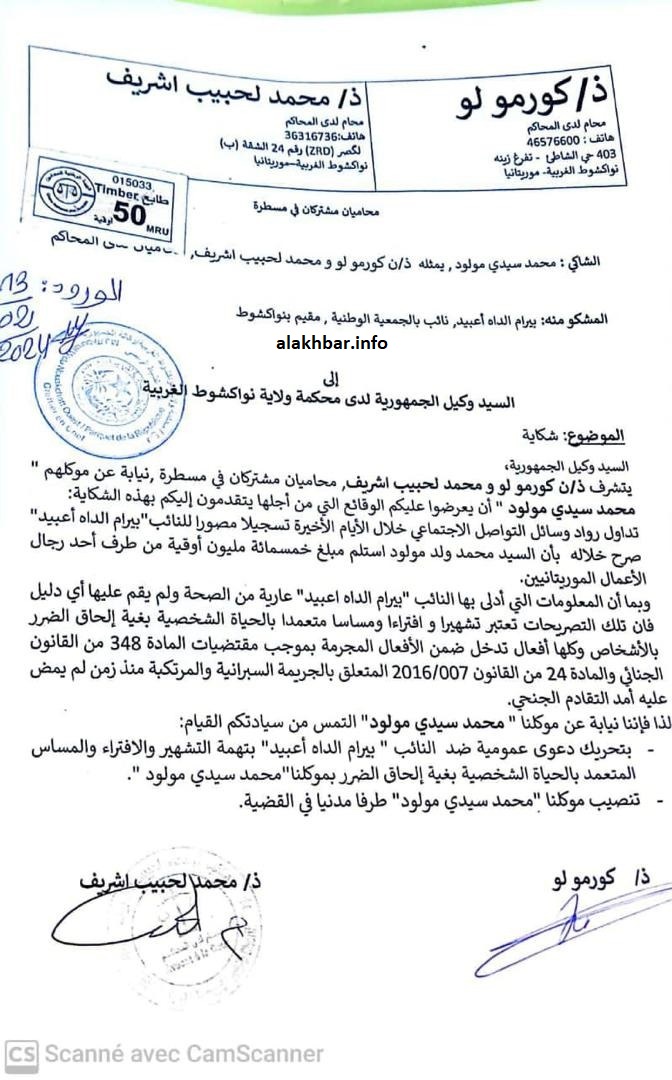 تقدم رئيس حزب اتحاد قوى التقدم محمد ولد مولود بشكوى أمام النيابة العامة من النائب البرلماني بيرام الداه اعبيدي "بتهمة التشهير والافتراء والمساس المتعمد بالحياة الشخصية بغية إلحاق الضرر".