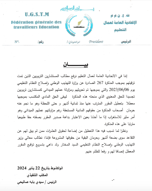 قالت الاتحادية العامة لعمال التعليم إن مذكرة ترقية المستشارين التربويين الصادرة عن وزارة التهذيب الوطني واصلاح النظام التعليمي في السادس يونيو الماضي لا تزال معطلة عن التنفيذ.