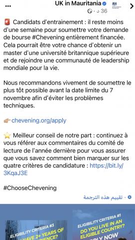 أعلنت سفارة المملكة المتحدة عن آخر موعد لاستلام ملفات المتقدمين لفرصة الفوز بمنحة تشيفيننغ وقالت السفارة أن التقدم لهذه المنحة يجب أن يكون قبل السابع من نوفمبر الجاري.