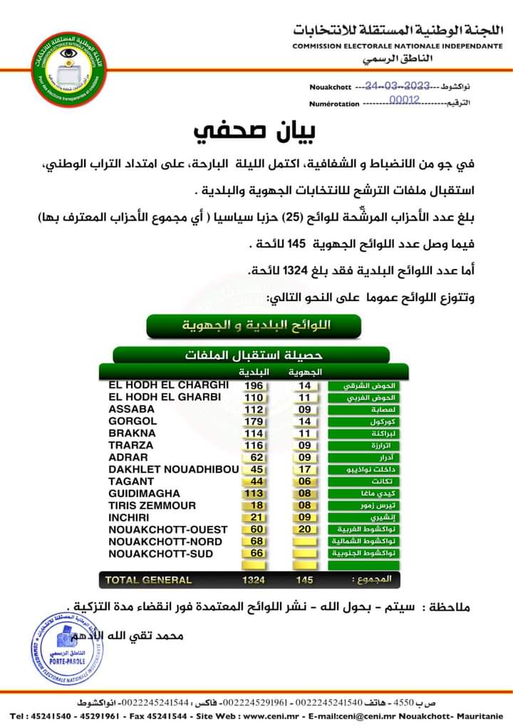 قالت اللجنة الوطنية المستقلة للانتخابات إن جميع الأحزاب المرخصة في موريتانيا قدمت لوائح للترشح في الانتخابات البلدية والجهوية.