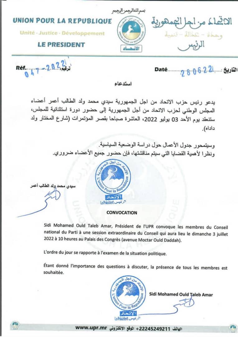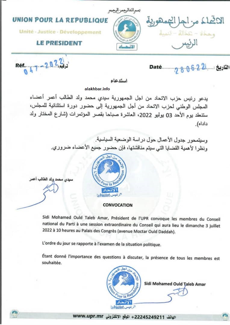 دعا رئيس حزب الاتحاد من اجل الجمهورية سيدي محمد ولد الطالب أعمر أعضاء المجلس الوطني إلى دورة استثنائية للمجلس، ستنعقد يوم الأحد (03 يوليو 2022).