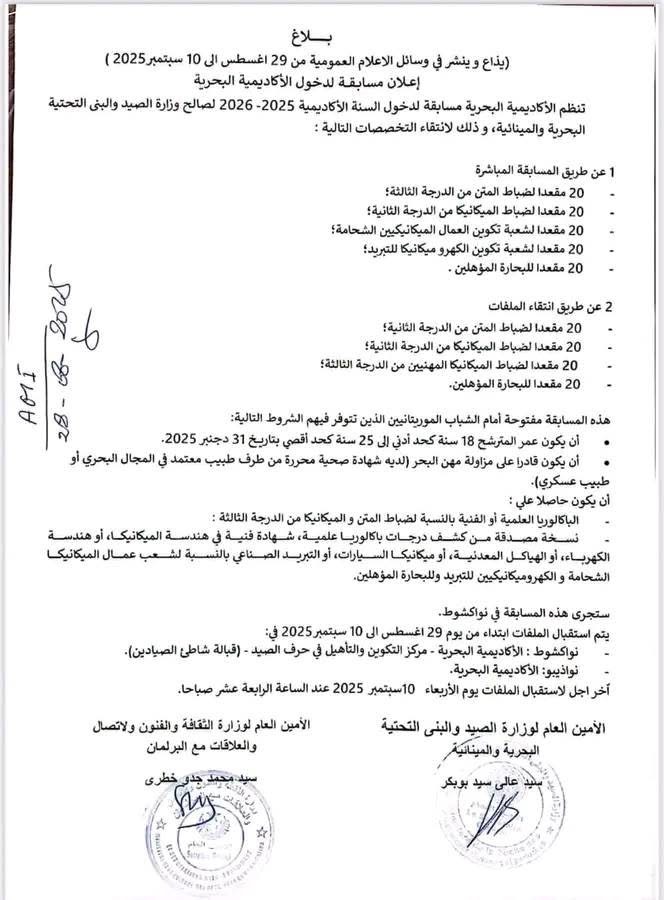 وأوضح الإعلان أن 100 مقعد ستخصص للمسابقة المباشرة، و80 مقعدا سيتم انتقاؤها عبر دراسة الملفات، مع اشتراط الجنسية الموريتانية، عمر بين 18 و25 سنة، القدرة على ممارسة مهن البحر، وتقديم شهادة صحية معتمدة.