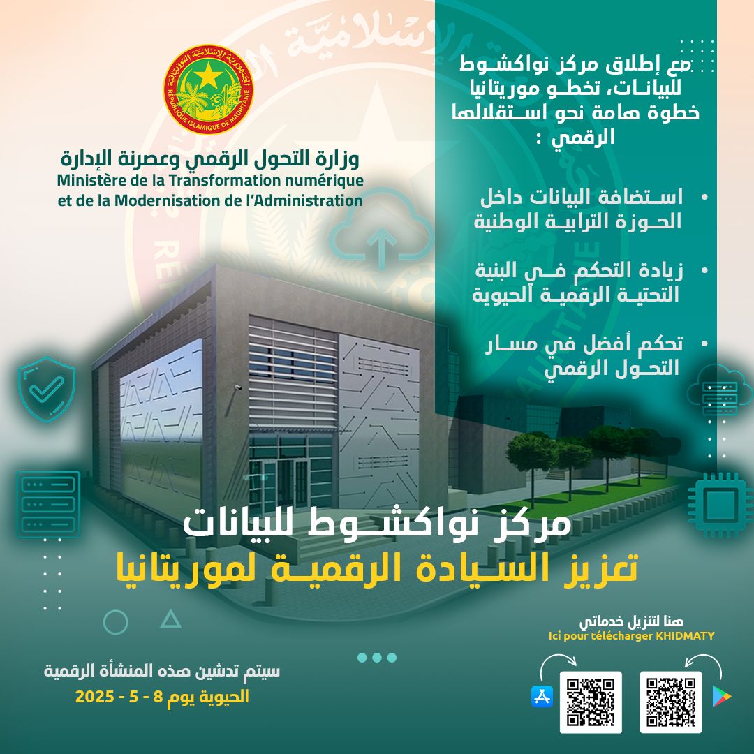 وأضافت الوزارة أن مركز البيانات الجديد يشكل نقطة تحوّل استراتيجية: بياناتنا تبقى في موريتانيا، محمية ومتاحة في بيئة وطنية آمنة، مضيفة أنه سيشكل "رافعة للبيانات الأساسية لانتقالنا الرقمي نحو المستقبل".