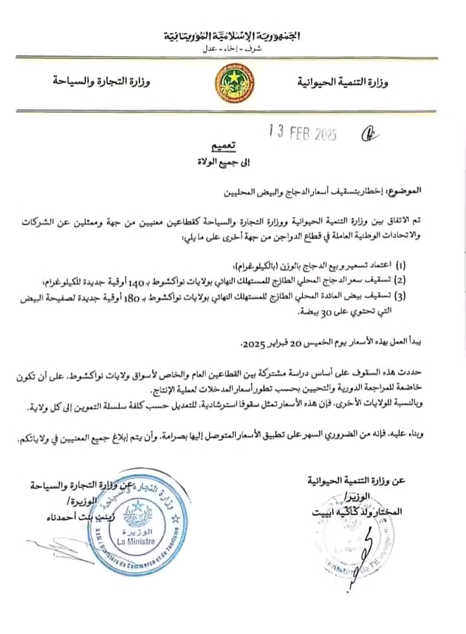 أعلنت وزارة التنمية الحيوانية مساء أمس عن تحديد أسعار ثابتة الدجاج والبيض المحليين على مستوى العاصمة نواكشوط .