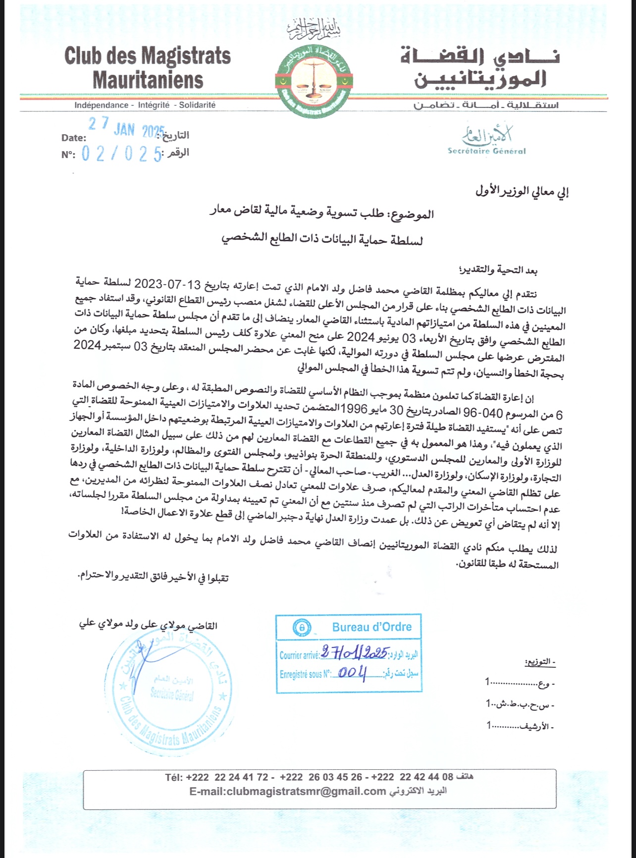 طالب نادي القضاة الموريتانيين الوزير الأول المختار ولد أجاي بتسوية ماقالوا إنها "مظلمة" القاضي محمد فاضل ولد الإمام المُعار لسلطة حماية البيانات ذات الطابع الشخصي، الذي "استثني" من الامتيازات المادية التي استفاد منها جميع المعينين في السلطة، وفقا للنادي.