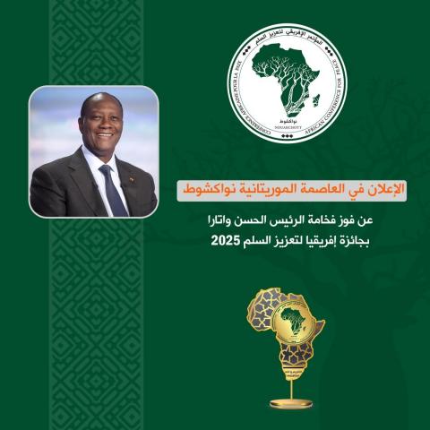 أعلن المؤتمر الإفريقي لتعزيز السلم في العاصمة الموريتانية نواكشوط عن فوز الرئيس الإفواري الحسن واتارا،"بجائزة إفريقيا لتعزيز السلم2025".