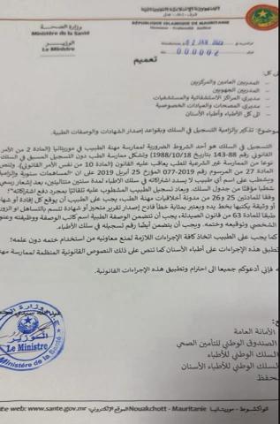 في بيان موجه من وزارة الصحة إلى المديرين العامين والمركزيين والجهويين ومدريري المستشفيات والمراكز والعيادات الخصوصية والمصحات على إلزامية التسجيل في السلك وبقواعد إصدار الشهادات والوصفات الطبية مشيرة إلى ضرورة التسجيل فيه كشرط ضروري لممارسة مهنة الطبيب في موريتانيا وفقا للمادة 2 من الأمر القانوني رقم88-143 بتاريخ 18/10/1988 .
