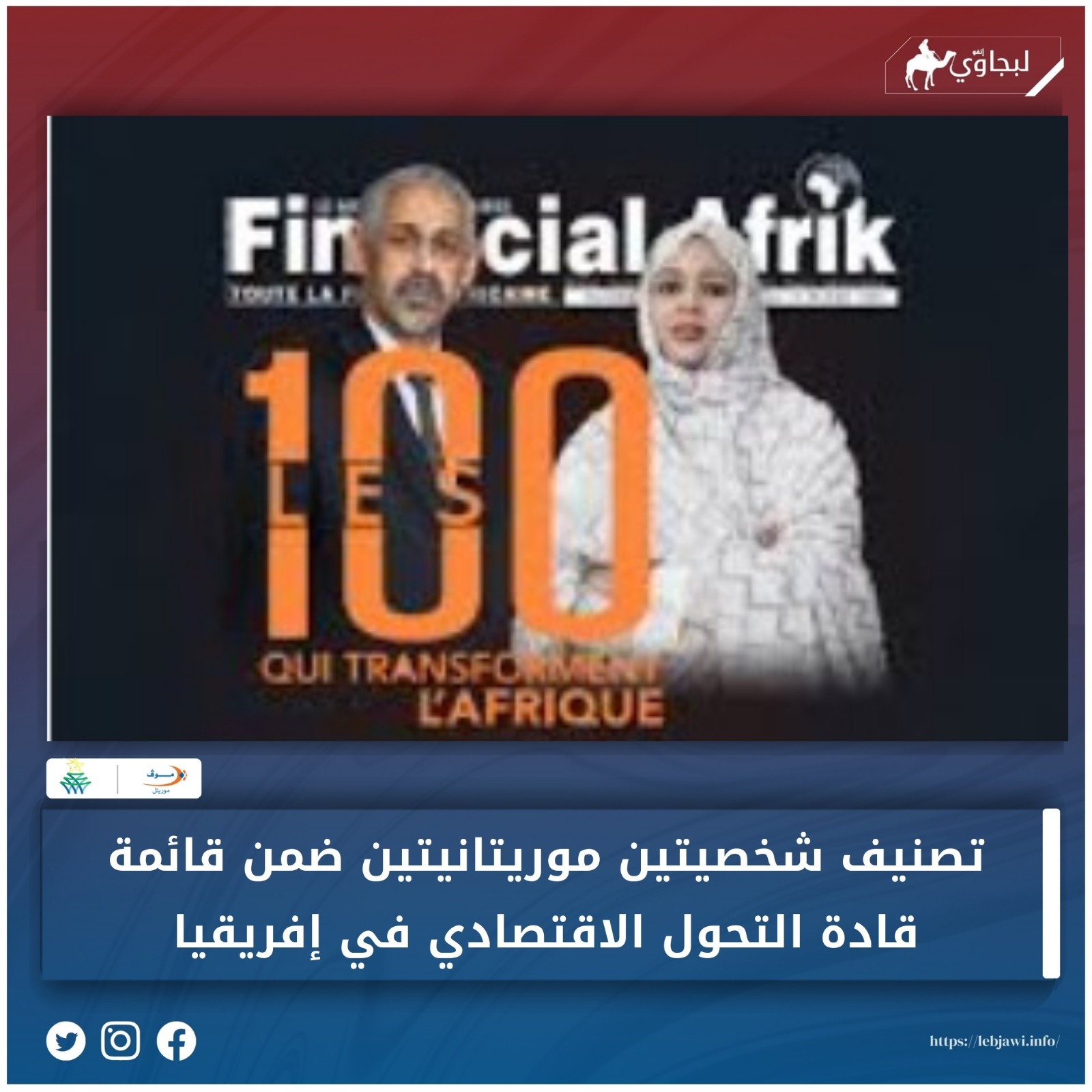 أصدرت مجلة فاينانشال أفريك المختصة في مجال المال والأعمال، تصنيفها السنوي للشخصيات الأفريقية الأكثر تأثيرًا في التحول الاقتصادي الذي تعيشه القارة، ومثلت موريتانيا في التصنيف من طرف سيدي ولد التاه وليلى بوعماتو.