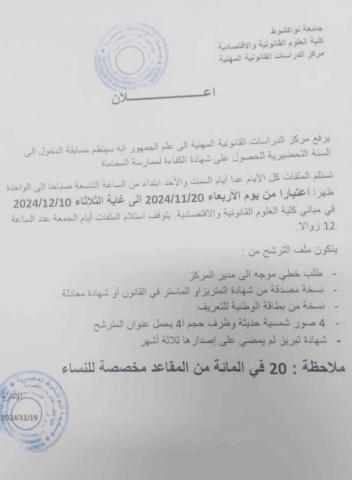 أعلن مركز الدراسات القانونية المهنية بنواكشوط، عن افتتاح التسجيل لمسابقة دخول السنة التحضيرية للحصول على شهادة الكفاءة المعنية لممارسة المحاماة.
