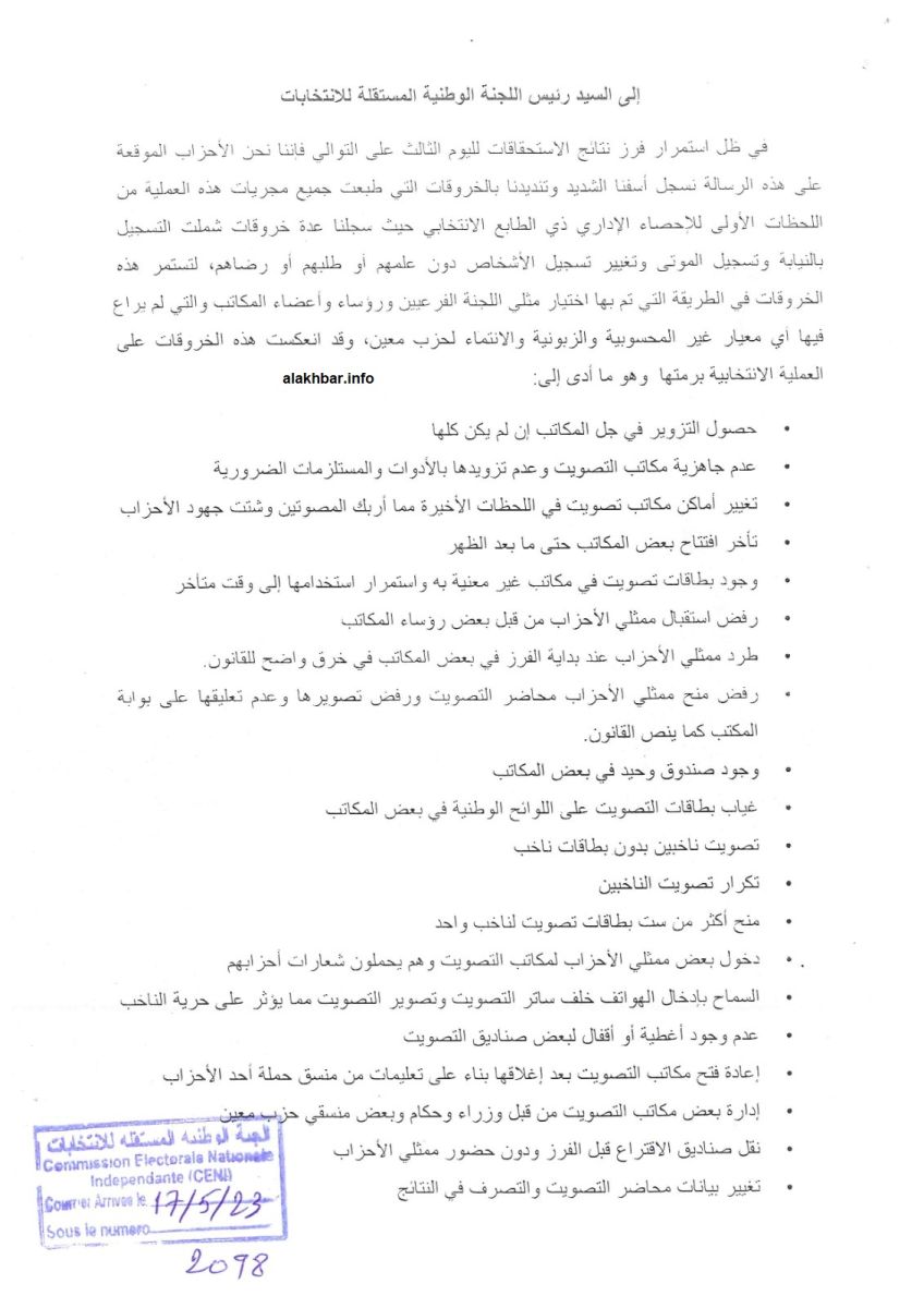 كما طالبت هذه الأحزاب في رسالة وجهتها للجنة الانتخابات وحصلت وكالة الأخبار المستقلة على نسخة منها بتبديل جميع رؤساء مكاتب التصويت، ووضع معايير دقيقة لاختيارهم.