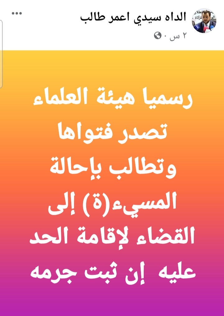 وكتب وزير الشؤون الإسلامية والتعليم الأصلي، الداه ولد أعمر طالب، على صفحته على فيسبوك، أن الهيئة، طالبت بإقامة الحد على «المسيء(ة) إن ثبت جرمه».