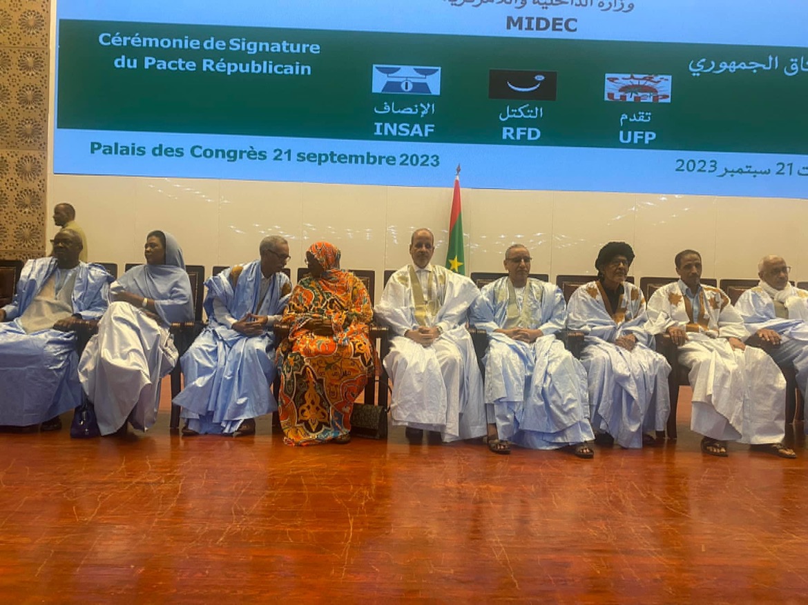 وقع كل من وزير الداخلية واللامركزية محمد أحمد ولد محمد الامبن؛ ورؤساء أحزاب "الإنصاف" (الحاكم) محمد ماء العينين ولد أيبه، وتكتل القوى الديمقراطبة (معارض) أحمد ولد داداه ، و اتحاد قوى التقدم (معارض) محمد ولد مولود؛ مساء الخميس في قصر المؤتمرات في نواكشوط، على وثيقة: الميثاق الجمهوري.