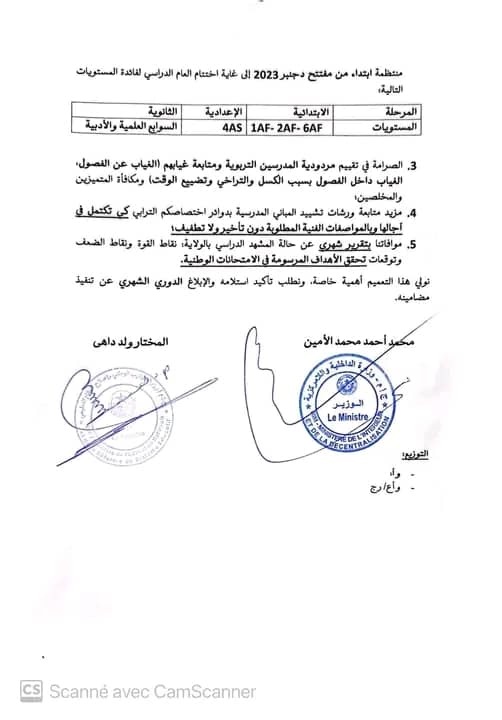 وطالب التعميم السلطات الإدارية "بالصرامة في تقييم مردودية المدرسين التربوية، ومتابعة غيابهم عن الفصول، بسبب الكسل والتراخي وتضييع الوقت، ومكافأة المتميزين والمخلصين".