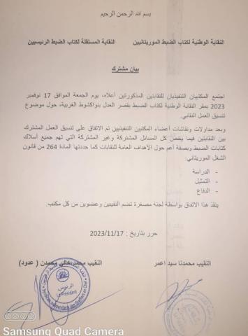 اصدرت نقابة كتاب الضبط الرئيسيين والنقابة الوطنية لكتاب الضبط بيانا مشتركا بتوقيع اتفاق اليوم الجمعة بقصر العدل بالغربية بتنسيق العمل المشترك بين النقابتين فيما يخص كل المسائل المشتركة وغير المشتركة التي تهم جميع أسلاك كتابات الضبط وبصفة أعم حول الأهداف العامة للنقابات كما حددتها المادة: 264 من قانون الشغل الموريتاني