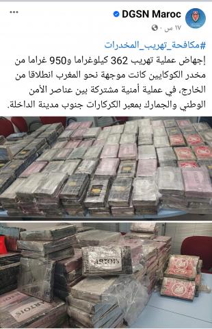 أعلنت السلطات المغربية أن عناصر الأمن الوطني والجمارك بمعبر الكركرات الحدودي مع موريتانيا، تمكنوا أمس الإثنين من إحباط عملية تهريب لشحنة كبيرة من المخدرات القوية، وحجز 362 كيلوغراما و950 غراما من مخدر الكوكايين كانت موجهة نحو المغرب
