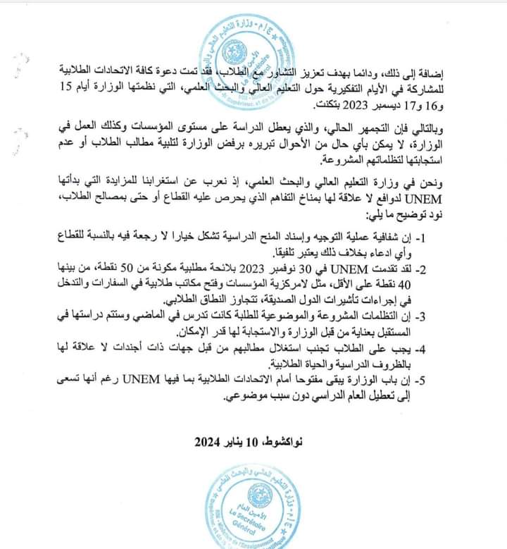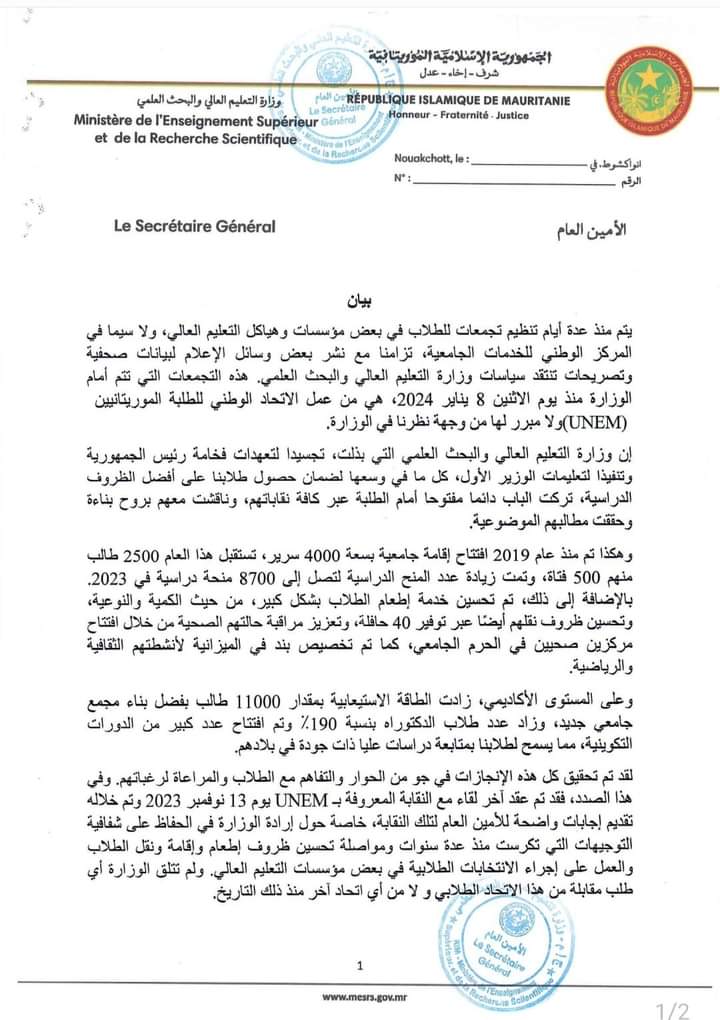 يتم منذ عدة أيام تنظيم تجمعات للطلاب في بعض مؤسسات وهياكل التعليم العالي، ولا سيما في المركز الوطني للخدمات الجامعية، تزامنا مع نشر بعض وسائل الإعلام لبيانات صحفية وتصريحات تنتقد سياسات وزارة التعليم العالي والبحث العلمي. هذه التجمعات التي تتم أمام الوزارة منذ يوم الاثنين 8 يناير 2024، هي من عمل الاتحاد الوطني للطلبة الموريتانيين (UNEM) ولا مبرر لها من وجهة نظرنا في الوزارة.