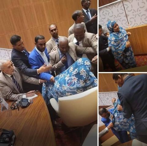 افراد من حرس الجمعية الوطنية باخراج النائب مريم بنت الشيخ عن حزب الصواب بالقوة من قاعة الجلسات تنفيذا لقرار اتخذه مكتب الجمعية الوطنية في حقها ،بسبب وصفها للوزير الاول ب"كلب الحراسة"