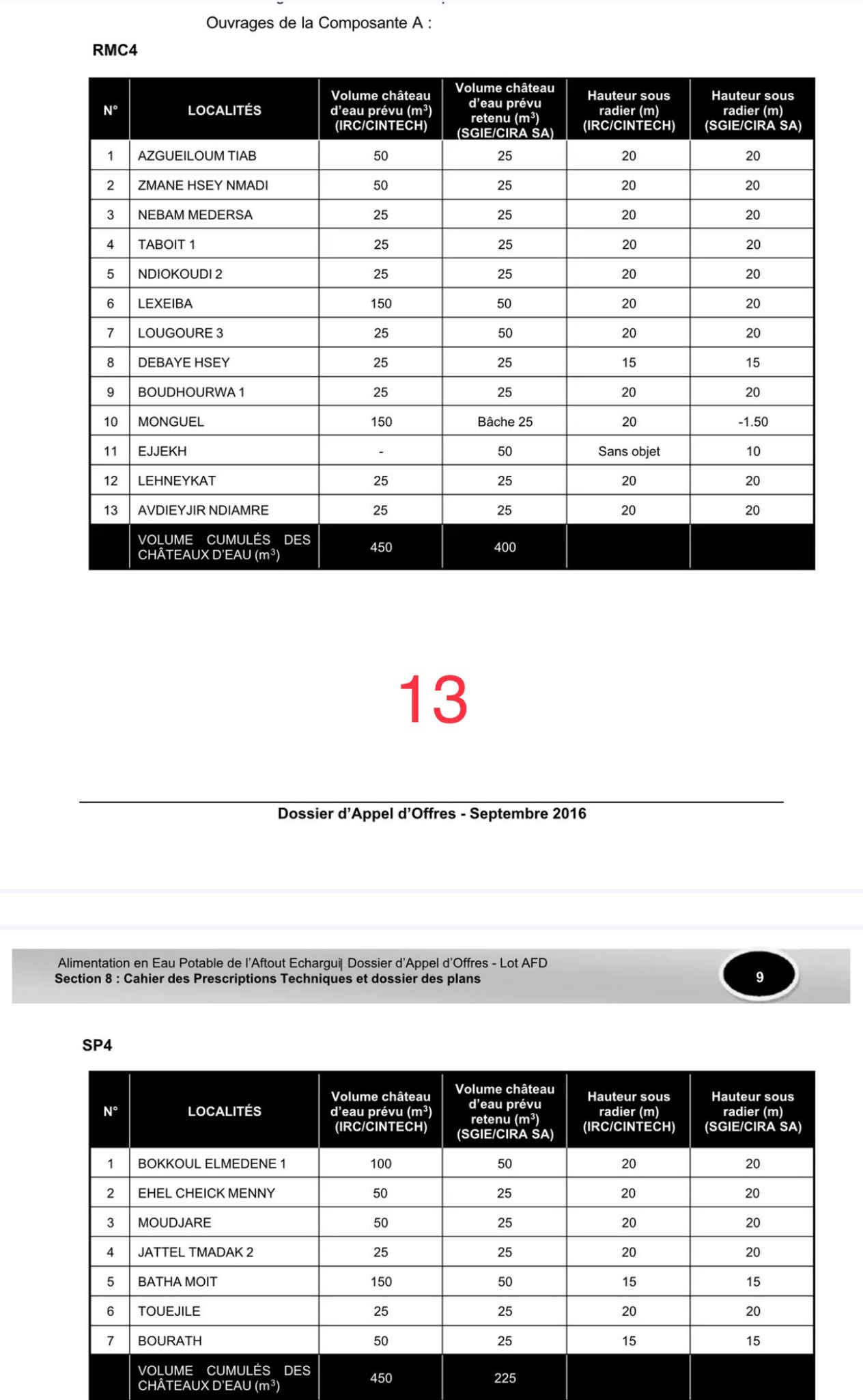 ولكن منظمة الشفافية الشاملة قارنت أماكن وجود الأبراج المائية التي تزودها هذه الأنواع من الأنابيب في الصفقة الأصلية (انظر الوثيقة) مع الأماكن التي وجدتها فيها البعثة المشتركة، فتوضح أنها في نفس المكان، مما يعني عدم زيادة المسافة، زد على ذلك أن 297,10 كم لم تنجز من الأنابيب التي كانت مبرمجة وأن ثلاثة من الأبراج اختفت أيضا !!! .