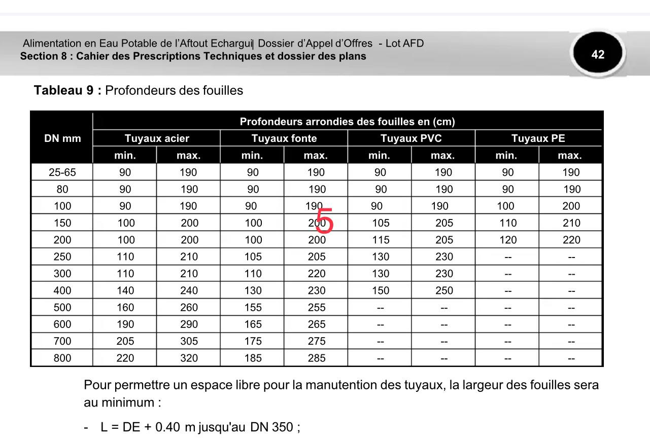 كما تبين أيضا أن عمليات الحفر للأنابيب وردمها التي زادت كلفتها على 6 مائة مليون (الفقرة أعلاه)، لم تحترم شروط الالتزامات، التي تنص كما هو مبين في (الوثيقة5 ) أن الحفر يجب أن يصل إلى عمق يتراوح بين تسعين (90) سم ومائة وتسعين (190) سم لأصغر الأنابيب، وذلك من أجل حمايتها من التعرض لمخاطر التلف مع مرور الزمن، لكن العكس هو ما حصل، وذلك طبعا من أجل خفض تكلفة الأشغال والاستيلاء على المبلغ الكبير المذكور أعلاه، دون بذل أي مجهود يذكر، ولا يمكن ذلك إلا بتواطئ مع مكتب الرقابة الذي يتقاضى ما يزيد على 500 مليون سنويا (الوثيقة 6)من أجل الرقابة و ضمان الجودة واحترام دفتر الشروط، وستلاحظون معنا أن الأنابيب المكشوفة على الأرض صادفتنا في كل مكان، مما يدل على أن عمق الحفر لم يتجاوز عشرين سم بدلا من 90 سم كحد أدنى إلى متر وتسعين سم، (الوثيقة: 7).