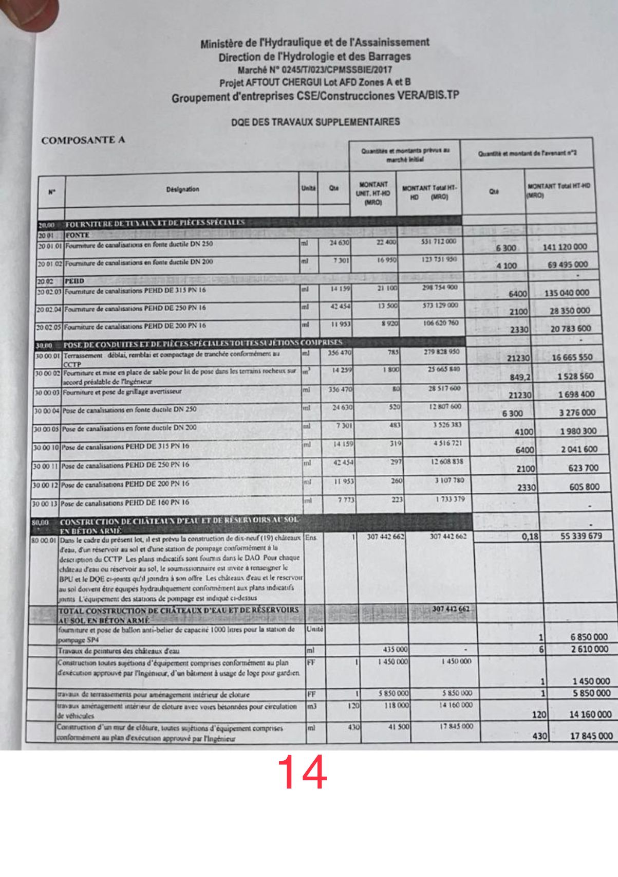 ويتضح من عرض الأسعار (Devis) لهذا الملحق (انظر الوثيقة 14)) أنه في سبيل الحصول على المبلغ الضخم الذي يتم السعي لاختلاسه، تمت زيادة كمية الأنابيب الأكبر والأغلى بمقدار الضعف، وتم اختيارها على ما يبدو بسبب وجودها تحت الأرض حتى يصعب التحقق منها.