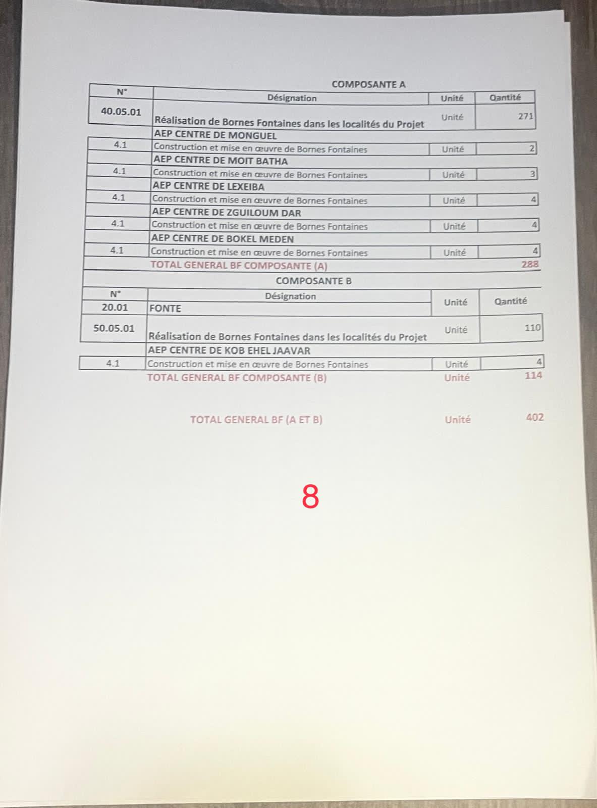 • و جزء ثان: يسعى إلى تزويد القرى المستفيدة، انطلاقا من الخزان الضخم في شلخت التياب، عبر شبكة من الأنابيب تُزود مئات الحنفيات العمومية، وذلك أساسا من خلال صفقتين كبيرتين فاز بهما تحالف ( groupement: CSE-VAERA-BIS TP) التابع لرئيس الاتحاد الوطني لأرباب العمل الموريتانيين، السيد زين العابدين، تبلغ الأولى (4.189.204.808 أوقية)، إضافة إلى إعفاء ضريبي بمبلغ (953.344.381 أوقية)، وهي الصفقة ( ( LOT 2-2 ) ، أما الثانية فتعرف بصفقة (AFD) نسبة إلى الوكالة الفرنسية للتنمية التي وفرت التمويل، وبلغت (5.828.639.234 أوقية قديمة) بالإضافة إلى إعفاء ضربي بقيمة : (1.785.299.365) أوقية قديمة