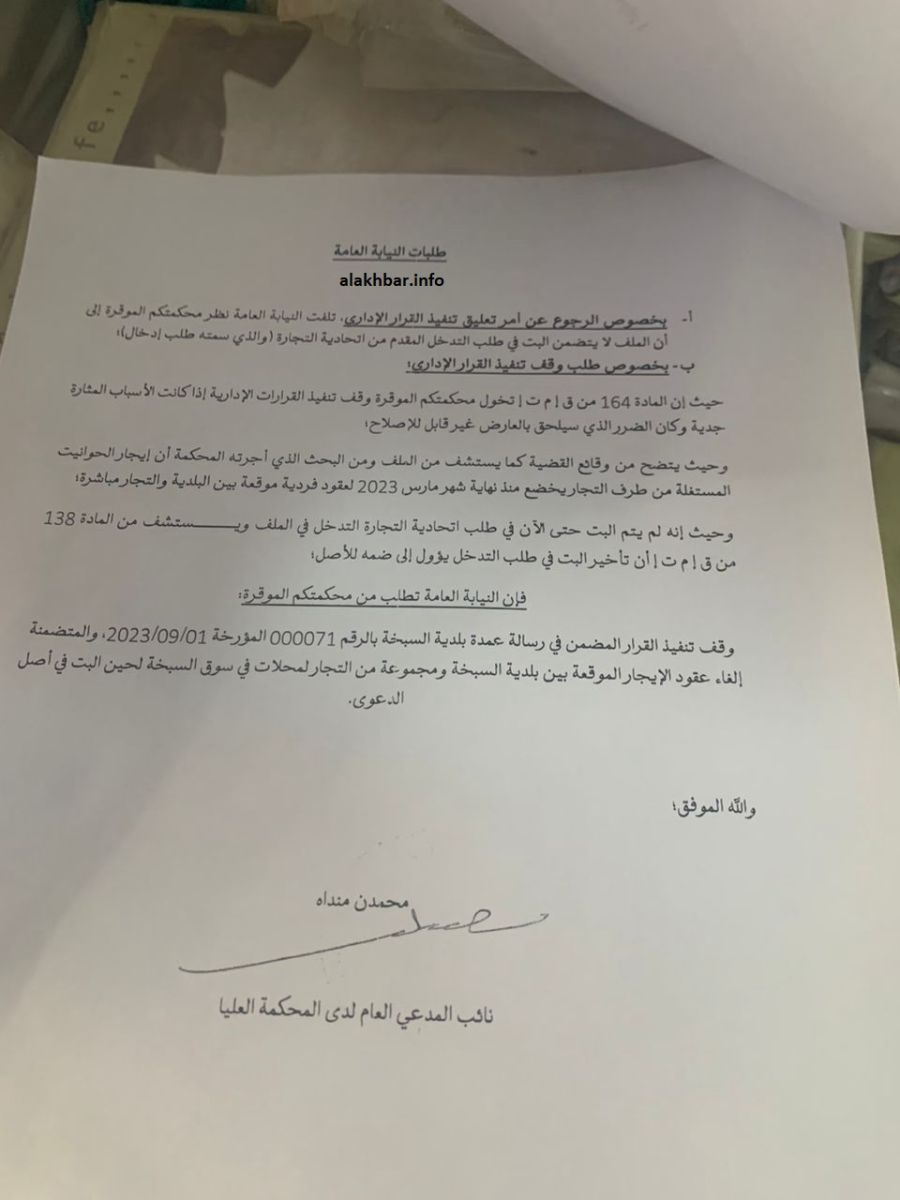 وقال المكتب في بيان وقعه باسمه سيد أحمد ولد يوسف إنه تلقى بكل حسرة وأسى خبر إلغاء الغرفة الإدارية في المحكمة العليا تعليق قرار عمدة بلدية السبخة القاضي بتجاوز القانون في موضوع الاتفاقية الموقعة بين البلدية والمؤجرين بشكل مباشر، وهو مؤشر خطير، وأمر مستهجن،