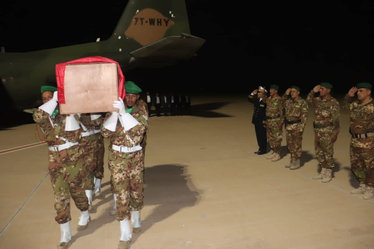 ترأس الفريق البحري اسلكو ولد الشيخ الولي قائد الأركان الخاصة لرئاسة الجمهورية الليلة البارحة في مطار أم التونسي مراسم تشييع جثمان الفقيد المساعد محمد ولد الشيباني،