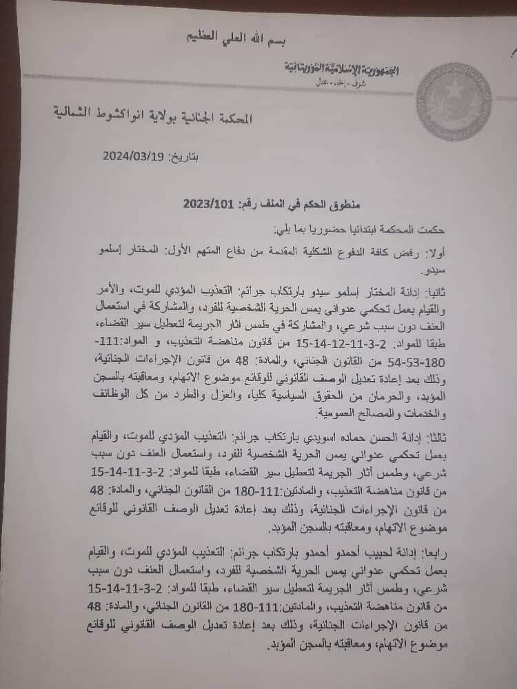 أصدرت المحكمة الجنائية بنواكشوط الشمالية، ليل الثلاثاء/ الأربعاء، حكمها بحق المتهمين في مقتل الناشط الحقوقي الصوفي ولد الشين، الذي توفي في مفوضية للشرطة بالهاصمة نواكشوط، قبل عام من الآن.