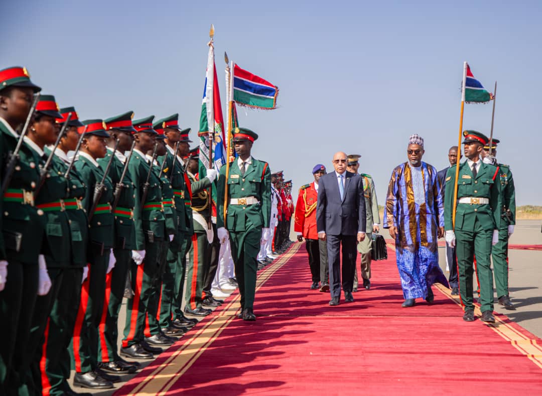 وكان في استقبال فخامة رئيس الجمهورية على أرضية مطار بانجول الدولي، نائب رئيس جمهورية غامبيا السيد محمد جالو، ومعالي وزير الشؤون الخارجية والتعاون والموريتانيين في الخارج السيد محمد سالم ولد مرزوگ، وسعادة سفيرنا في بانجول السيد حمود ولد عبدي، وأعضاء بعثتنا الدبلوماسية في بانجول.