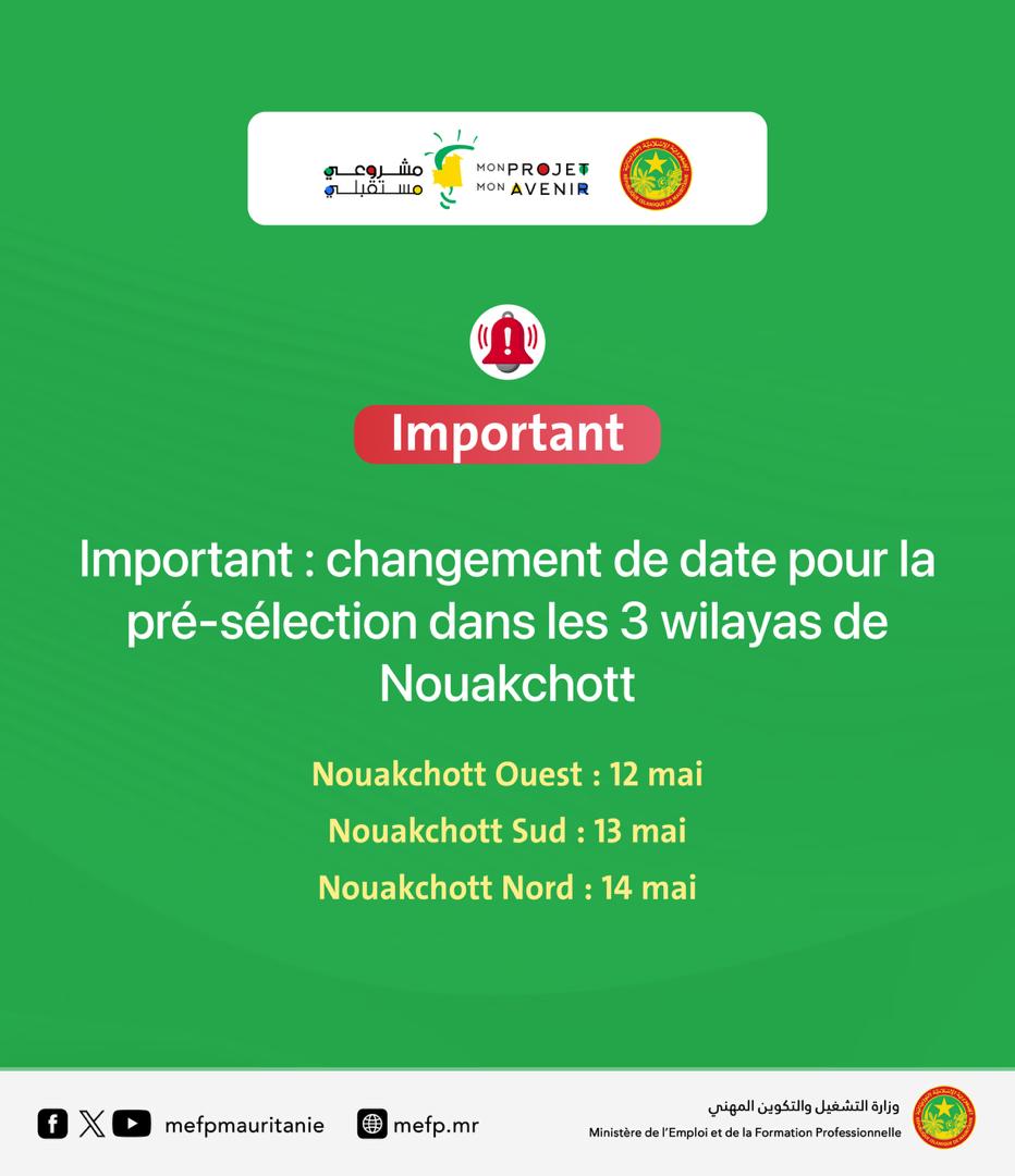 أعلنت وحدة "مشروعي مستقبلي" اليوم الخميس تغيير موعد الانتقاء الأولي لمشاريع النسخة الرابعة من برنامجها على مستوى ولايات نواكشوط الثلاث.