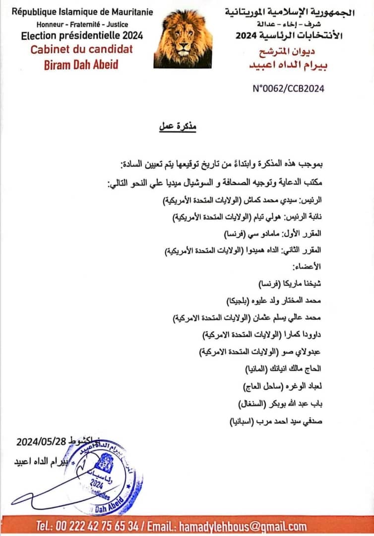أصدرت حملة المترشح بيرام الداه أعبيد تعيينات للطواقم المكلفة بالدعاية وتوجيه الصحافة والسوشيال ميديا، وشملت هذه التعيينات مدونين وناشطين في الخارج.