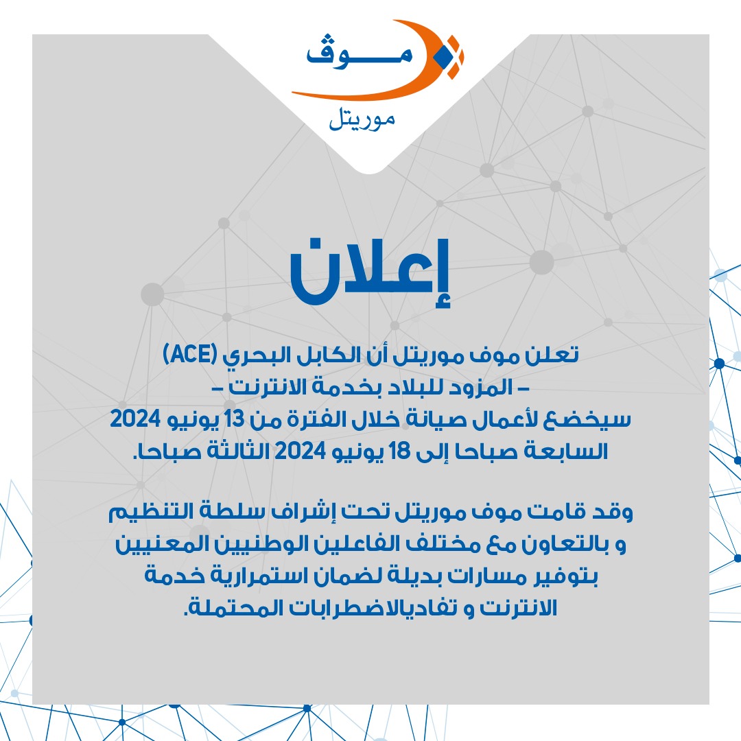 تعلن موف موريتل أن الكابل البحري (ACE) - المزود للبلاد بخدمة الانترنت- سيخضع لأعمال صيانة خلال الفترة من 13 يونيو 2024 السابعة صباحا إلى 18 يونيو 2024 الثالثة صباحا.