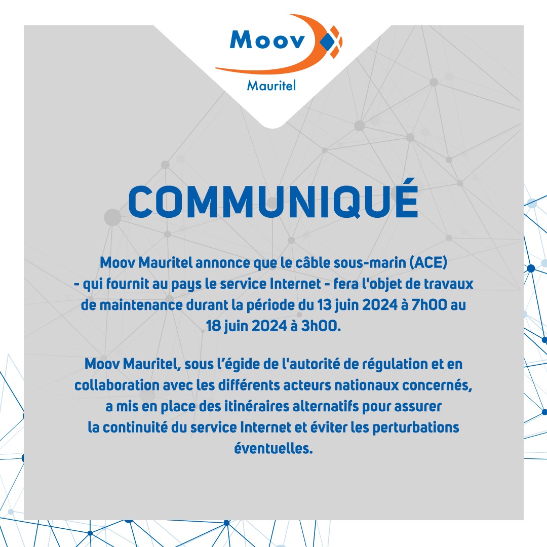Moov Mauritel annonce que le câble sous-marin (ACE) - qui fournit au pays le service Internet - fera l'objet de travaux de maintenance durant la période du 13 juin 2024 à 7h00 au 18 juin 2024 à 3h00.
