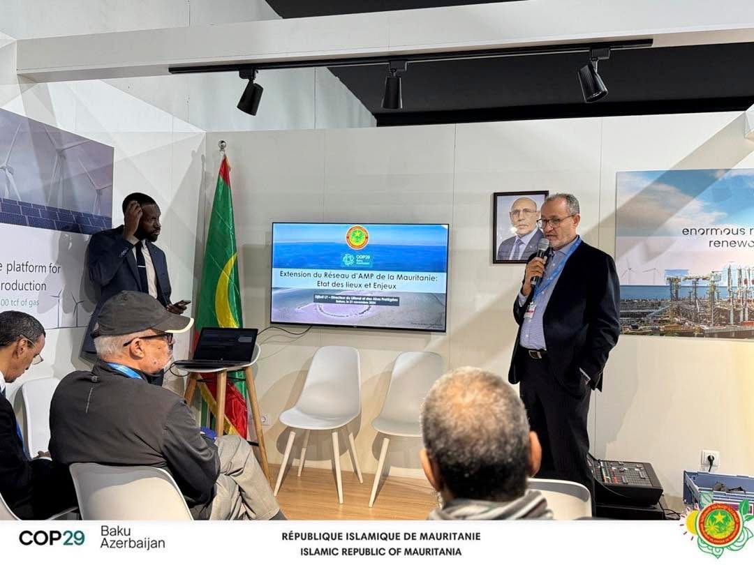 اختتمت موريتانيا مشاركتها في مؤتمر الأطراف كوب 29، على نحو باهر ، بتنظيم حدث جانبي يوم امس الخميس 21 نوفمبر بعنوان : "الاستراتيجية الوطنية للمحميات البحرية في موريتانيا : نحو تحقيق أهداف الإطار العالمي لما بعد 2020".